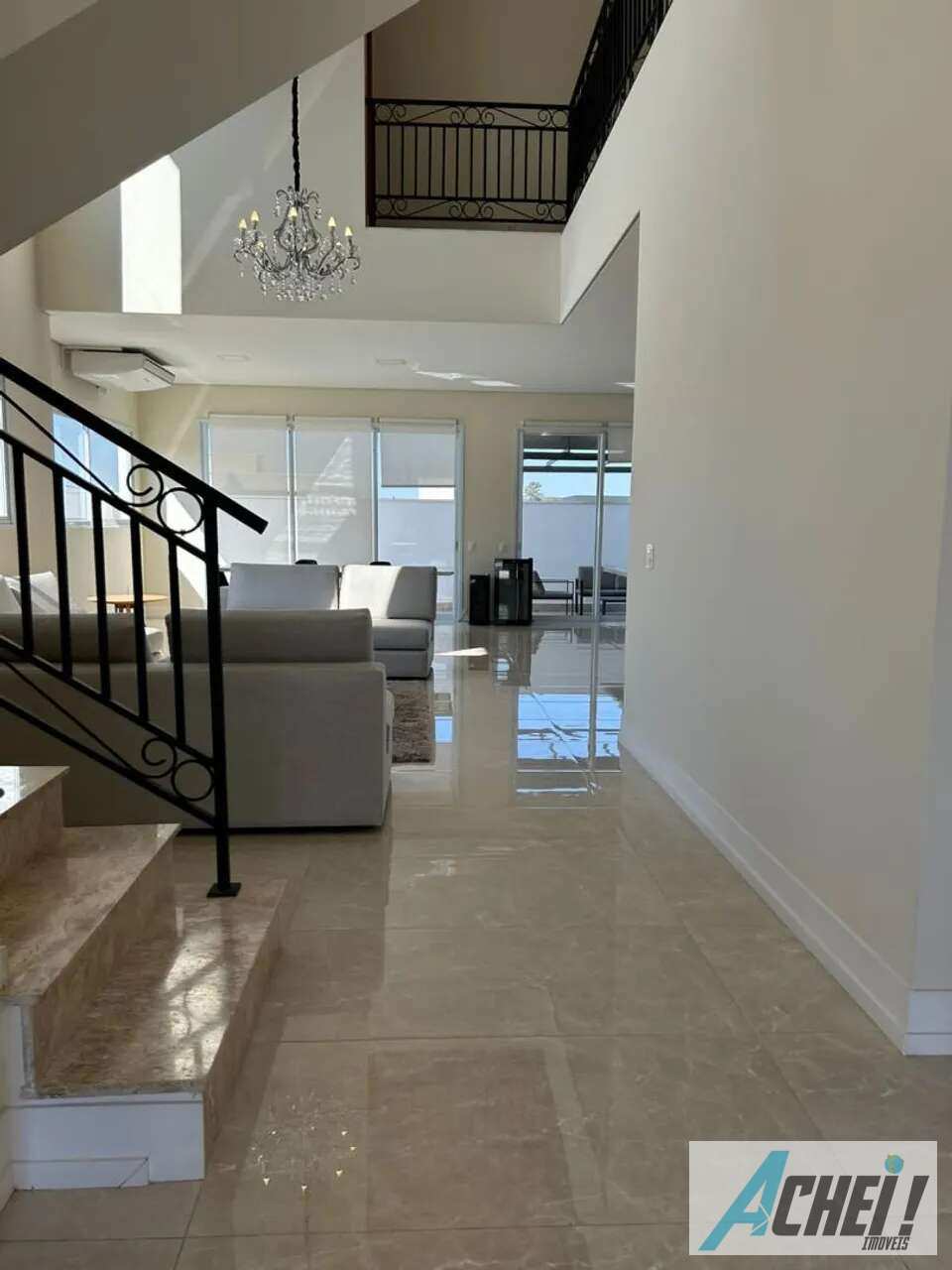 Sala ampla com pé-direito duplo e ar-condicionado, proporcionando excelente iluminação natural e imponência ao ambiente
